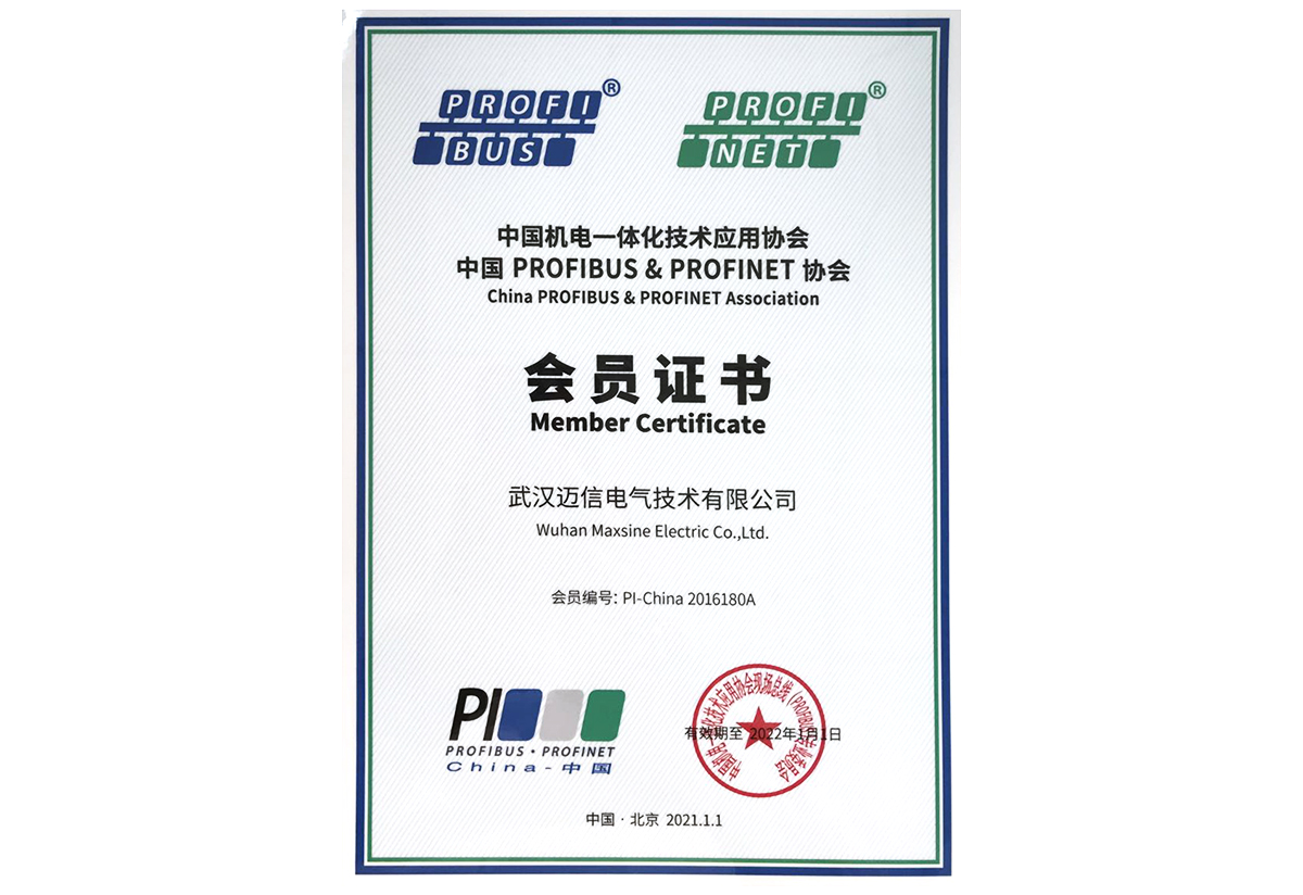 • 2021年度中國機電一體化技術應用單位、中國PROFIBUS&PROFINET協會 會員證書 頒發時間:2021年1月 頒發單位:中國PROFIBUS&PROFINET協會