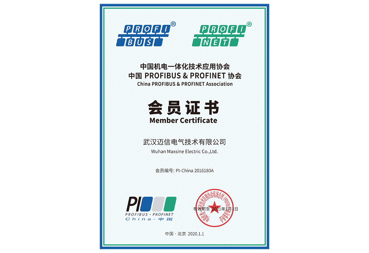 • 2020年度中國機電一體化技術應用單位、中國PROFIBUS&PROFINET協會 會員證書 頒發時間:2020年1月 頒發單位:中國PROFIBUS&PROFINET協會