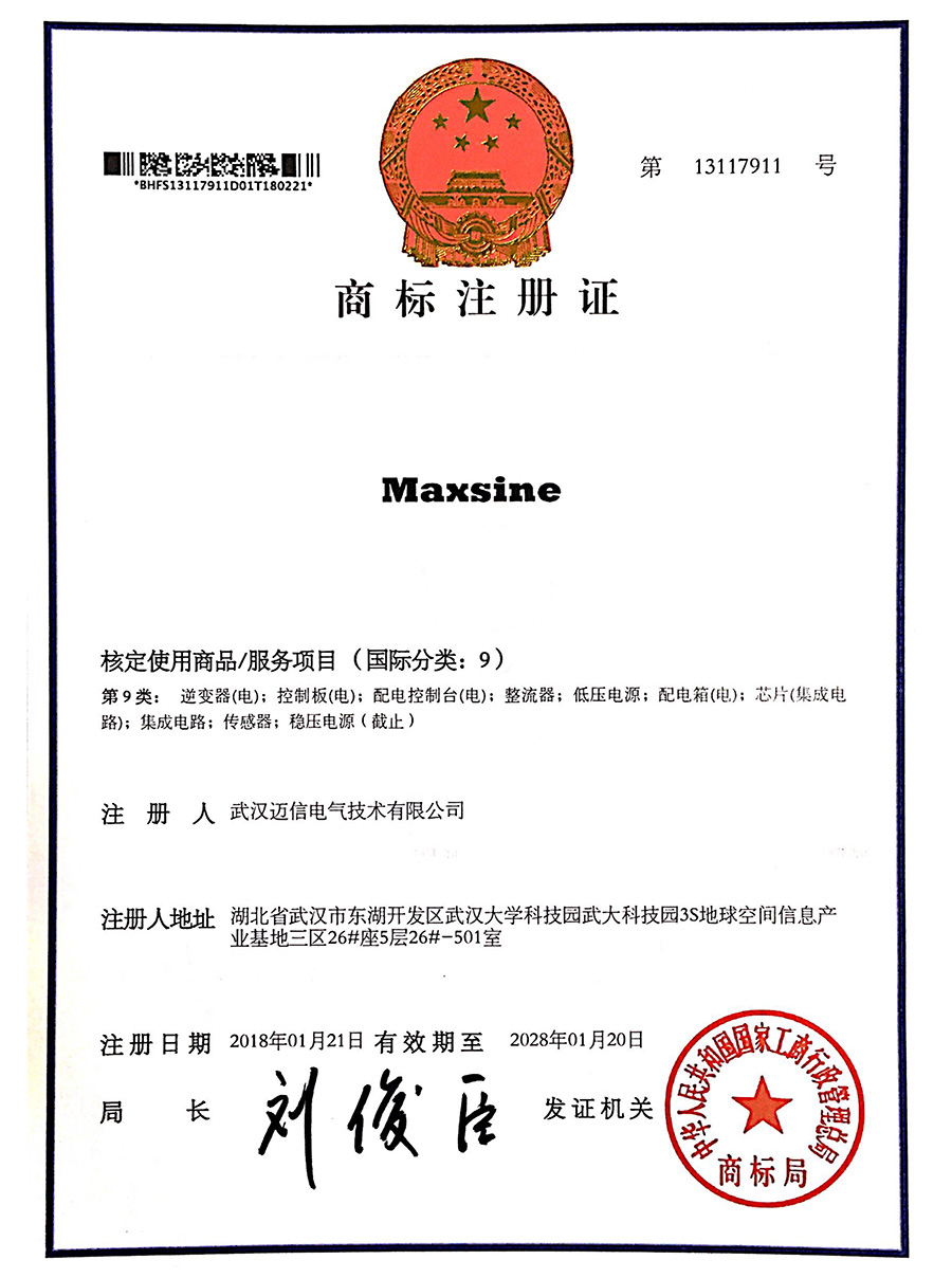 2018年1月21日,武漢邁信電氣技術有限公司Maxsine®英文商標正式注冊。