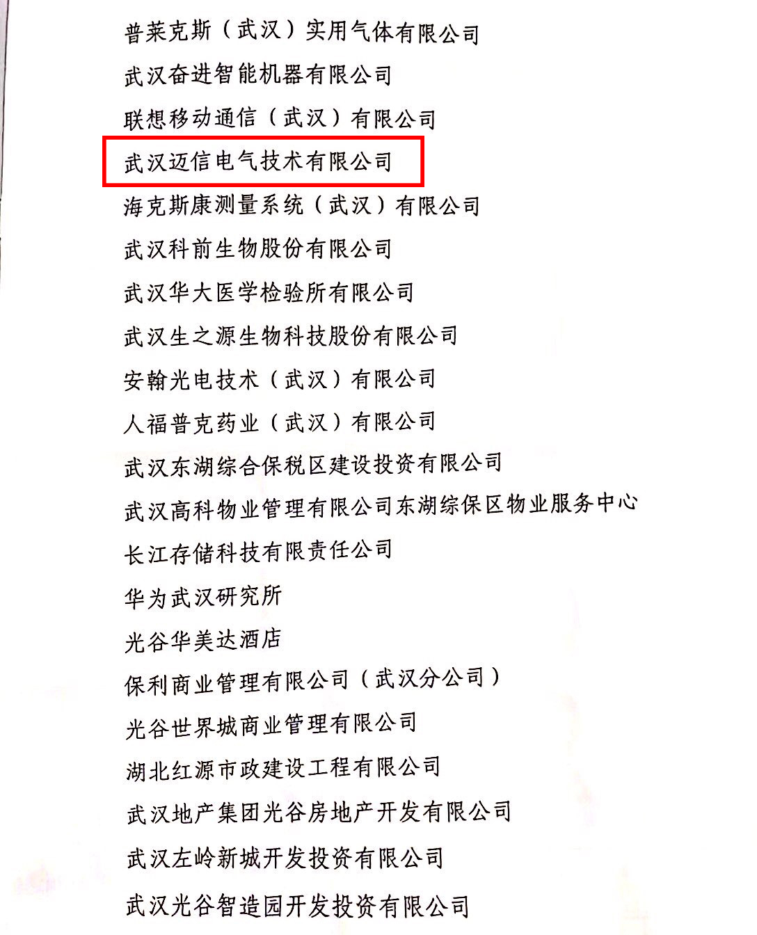武漢東湖新技術開發區安全生產委員會發布《武漢東湖新技術開發區安全生產委員會關于表彰2017年度東湖高新區(武漢自貿片區)安全生產工作優秀單位和先進個人的通報》(武新管安〔2018〕5號)公布:武漢邁信電氣技術有限公司被評為安全生產標準化企業。