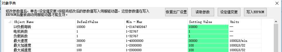 最大加減速度、Jog點動參數、回零參數等都可通過ServoSoftStudio中的對象字典編輯器設置。