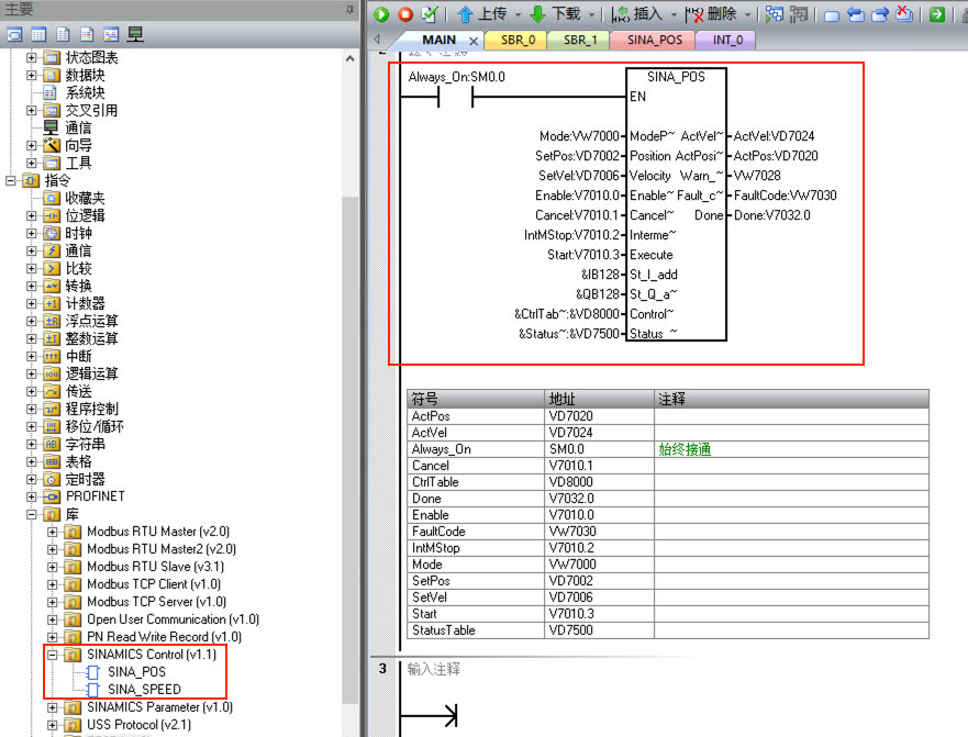 7. 主程序中編寫程序,SINA_POS功能塊的St_I_add和St_Q_add的地址與步驟5中111報文的輸入輸出地址對應