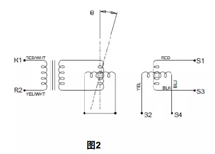 與編碼器類似,旋轉變壓器也是將機械運動轉化為電子信號的轉動式機電裝置。但與編碼器不同的是,旋轉變壓器傳輸的是模擬信號而非數字信號。基本組成方面,旋轉變壓器由1個一次繞組和2個相位在機械上成90°的二次繞組組成,見圖2所示。旋轉變壓器的輸出信號需要控制器能夠轉換模擬信號的信號輸入電路。