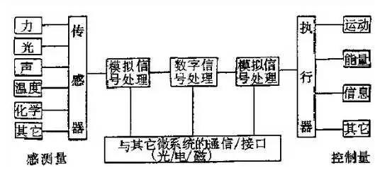 MEMS簡單來說就是將傳統傳感器的機械部件微型化后,和其他元件如微執行器和微電子器件組成的集成體。雖說如此,MEMS并不像編碼器一樣必須要有電路板、碼盤等固定元件,其高集成度特點可以根據不同的工控場合進行任意元件的組合,而典型的MEMS系統如下圖所示: