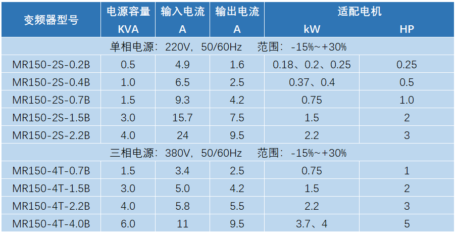 MR150 系列多功能緊湊型變頻器是一款功能豐富、體積緊湊、具有很強價格競爭優勢的機型。特別適合電子設備,食品包裝,木工,跑步機等小功率傳動的場合。