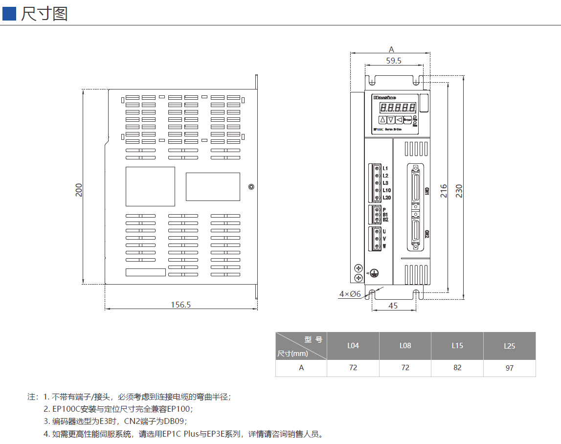 該系列CN1、CN2端子采用EP100同款接插件,安裝尺寸與定位尺寸完全兼容EP100。